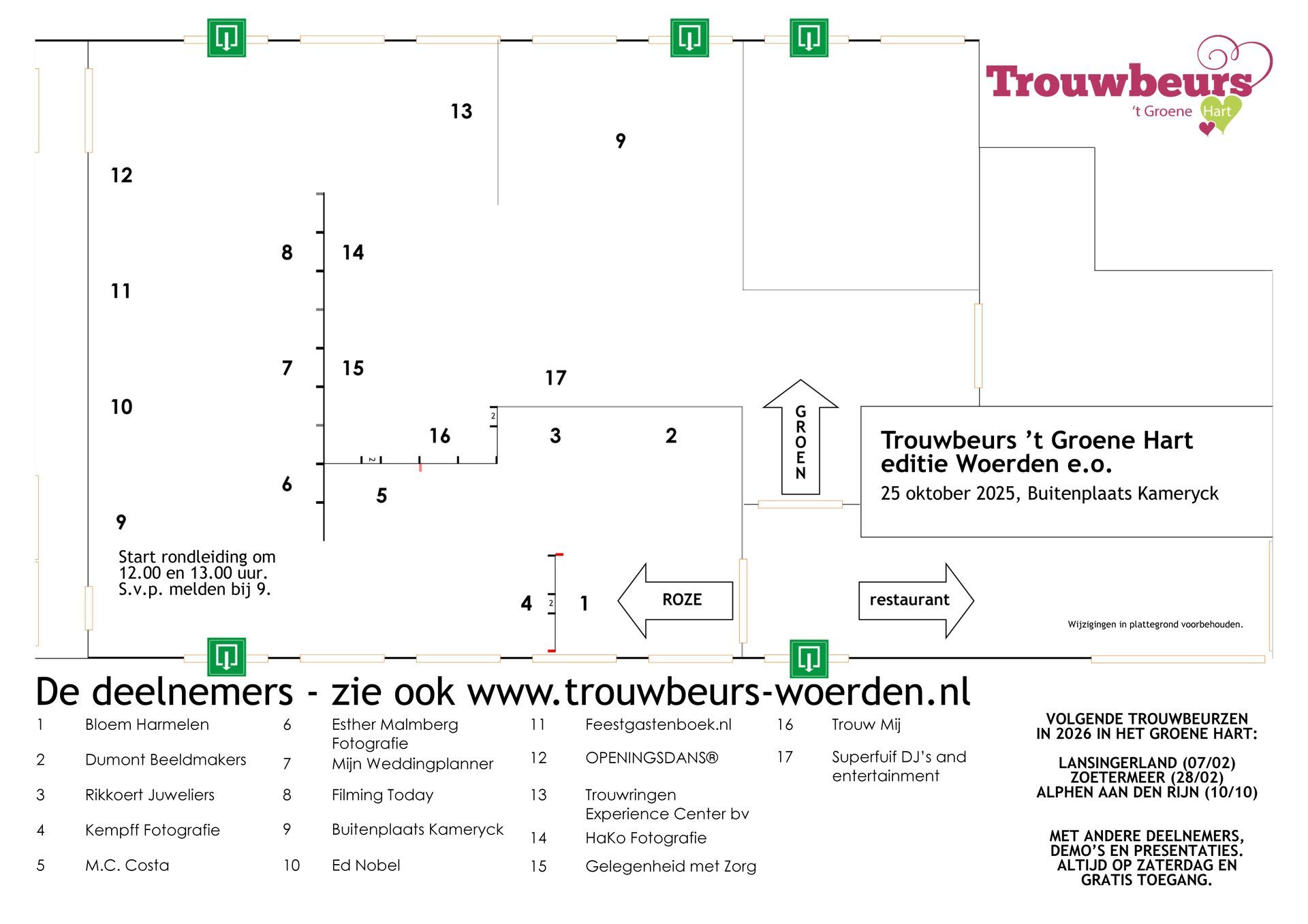 Trouwbeurs Woerden vindt plaats op zaterdag 25 oktober 2025 van 11.00 tot 14.00 uur. Je bent dan welkom in Buitenplaats Kameryck aan het Oortjespad 3 in Kamerik.