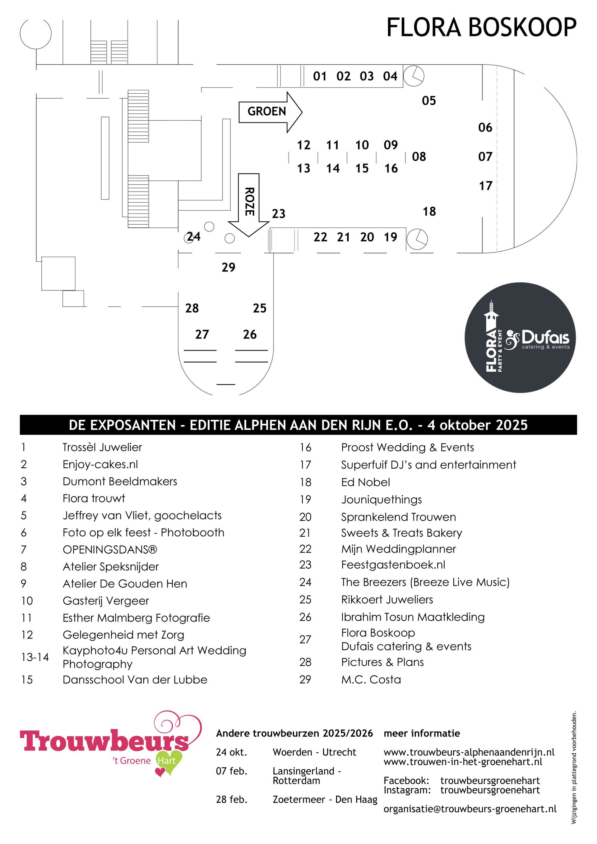 Trouwbeurs 't Groene Hart, editie Alphen aan den Rijn, vindt plaats op zaterdag 4 oktober 2025 van 11.00 tot 15.30 uur. Je bent dan welkom in Flora Boskoop aan de Parklaan 4.
