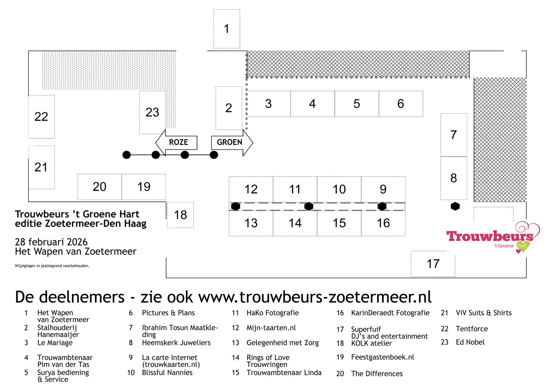 Trouwbeurs 't Groene Hart, editie Zoetermeer, vindt plaats op zaterdag 28 februari 2026 van 11.00 tot 15.30 uur. Je bent dan welkom in Het Wapen van Zoetermeer aan de Zegwaartseweg 31.